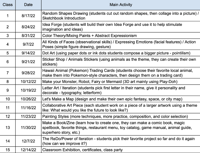 My curriculum is a blend of lessons I learned as an art student and things I had fun making (or treasured) as a child. It’s designed to build their creative knowledge and skills through an activity they have a natural interest in.
